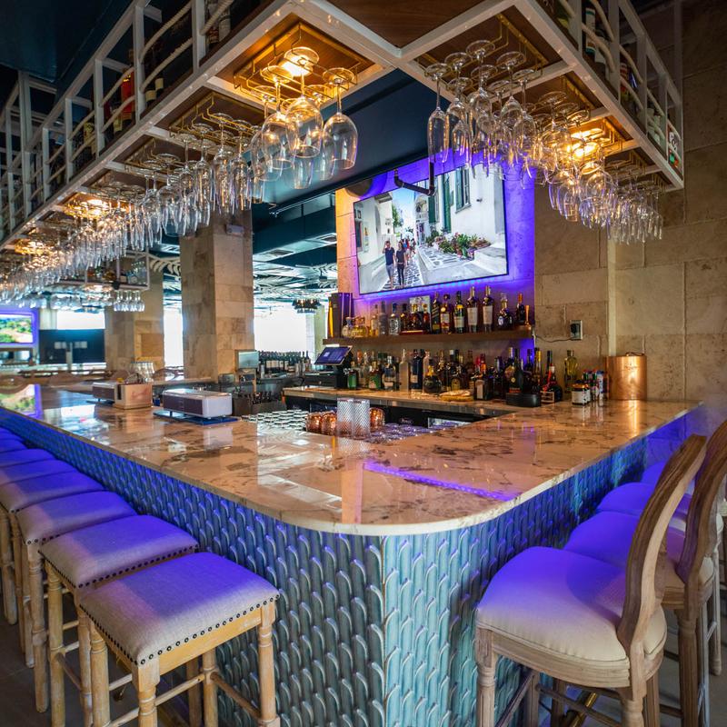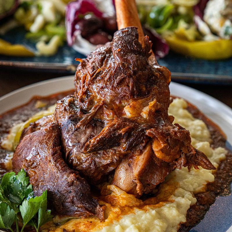 Greek lamb shank, on a bed of mashed potatoes and sauce Interior, seating area, tables and chairs Interior, lounging area Green olive jars Various dishes wrapped in red endive leaves Greek salad Packages of oregano Interior, dining area, fully set table Chopped salad Interior, bar area Interior, dining tables set for guests Shrimp in pesto sauce Cheese dip Wooden cabinet, pillows and wall decorations